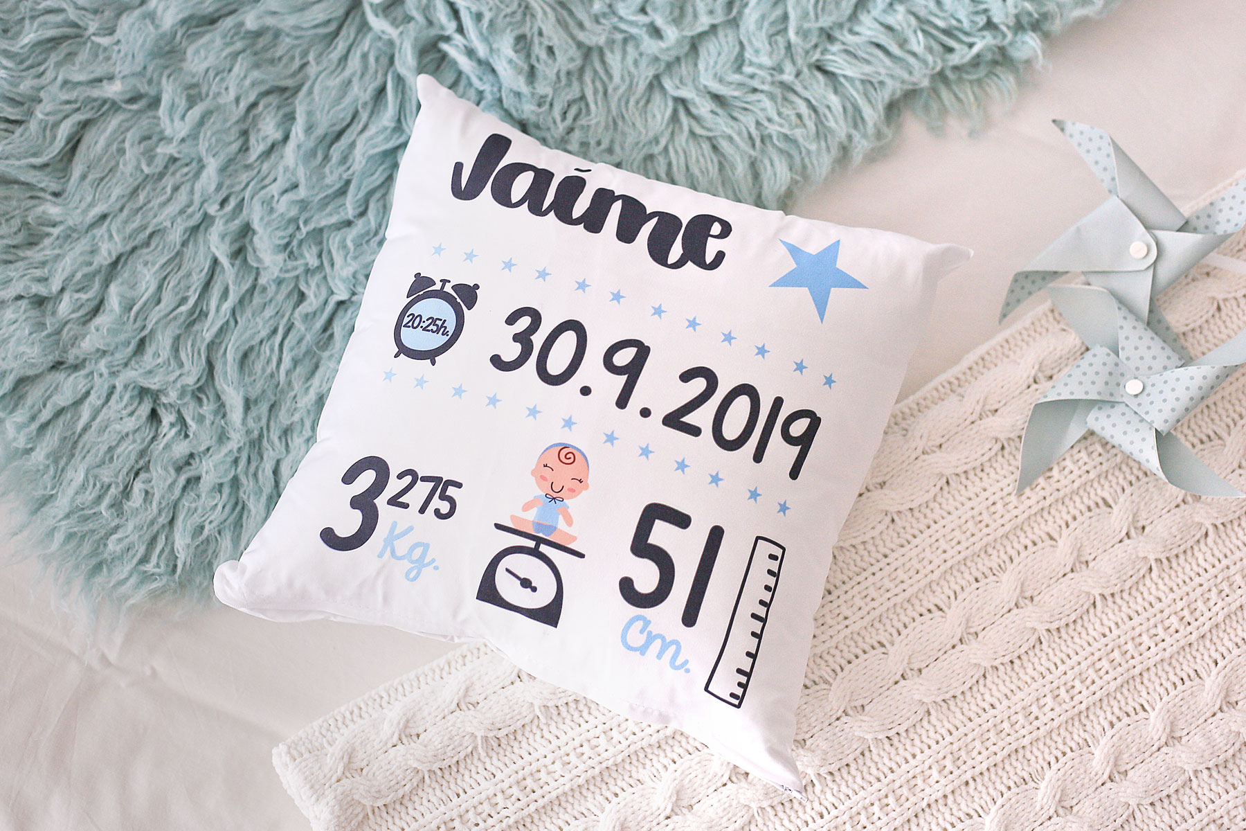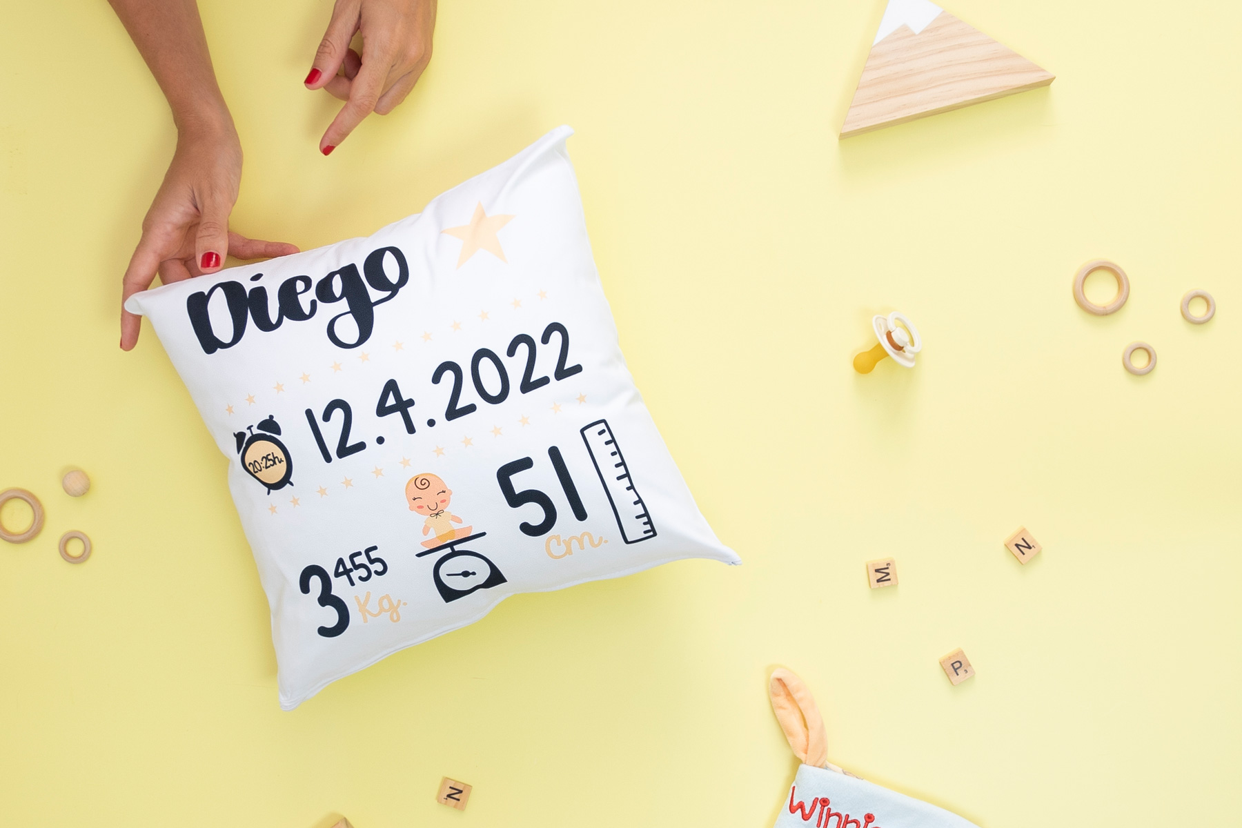 Una fecha, una hora, un peso y una medida pueden ser números sin importancia por sí solos, pero que, al unirlos a un nombre, llegan a adquirir un significado especial. Reúne todos estos detalles en un sencillo diseño y plásmalo en un cojín para crear un recuerdo que colocar en la cuna junto a tu bebé mientras crece.