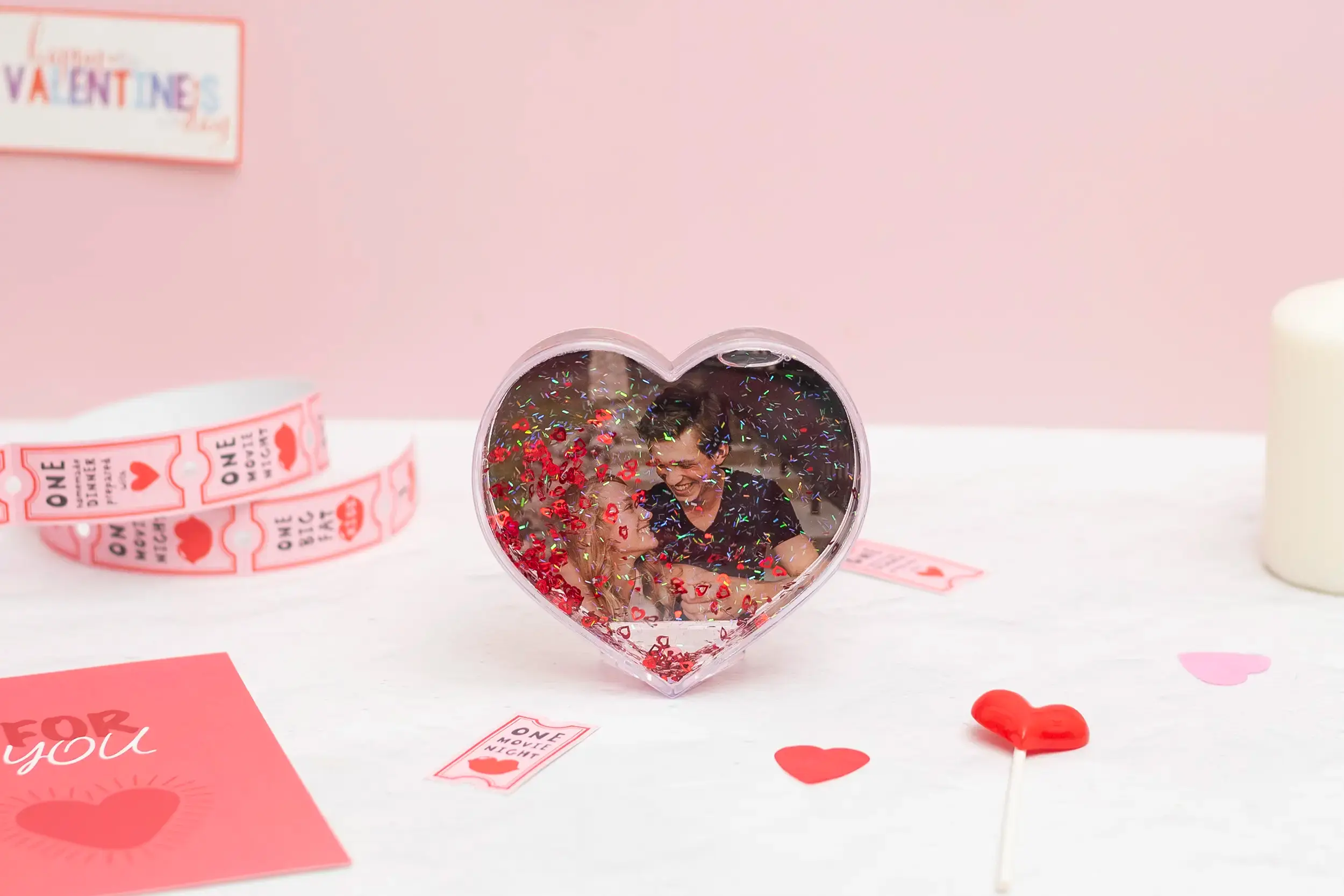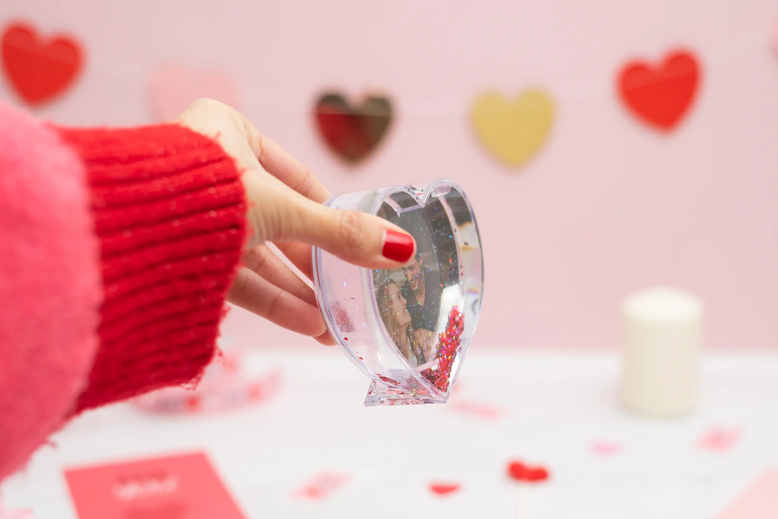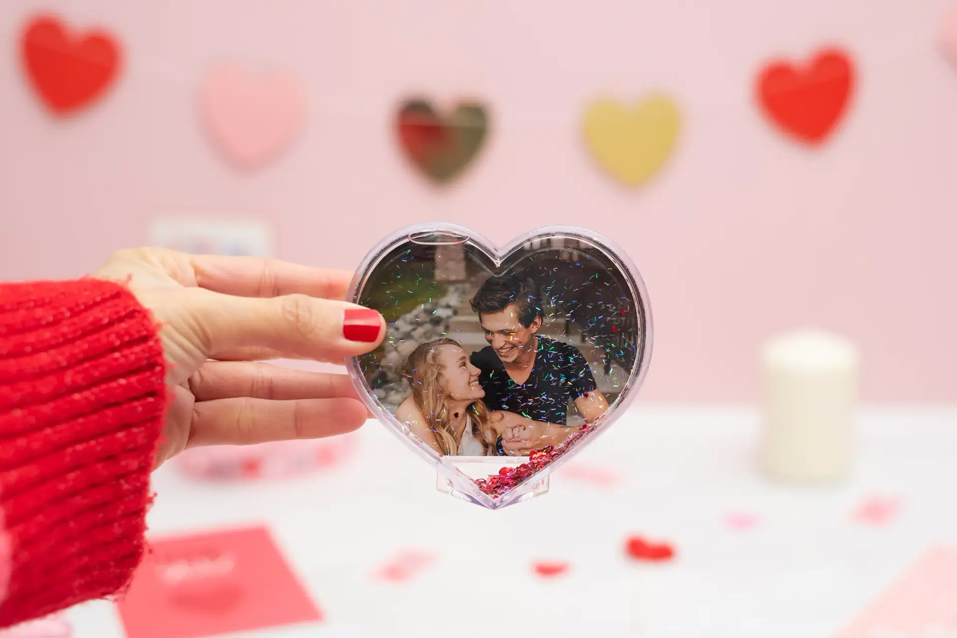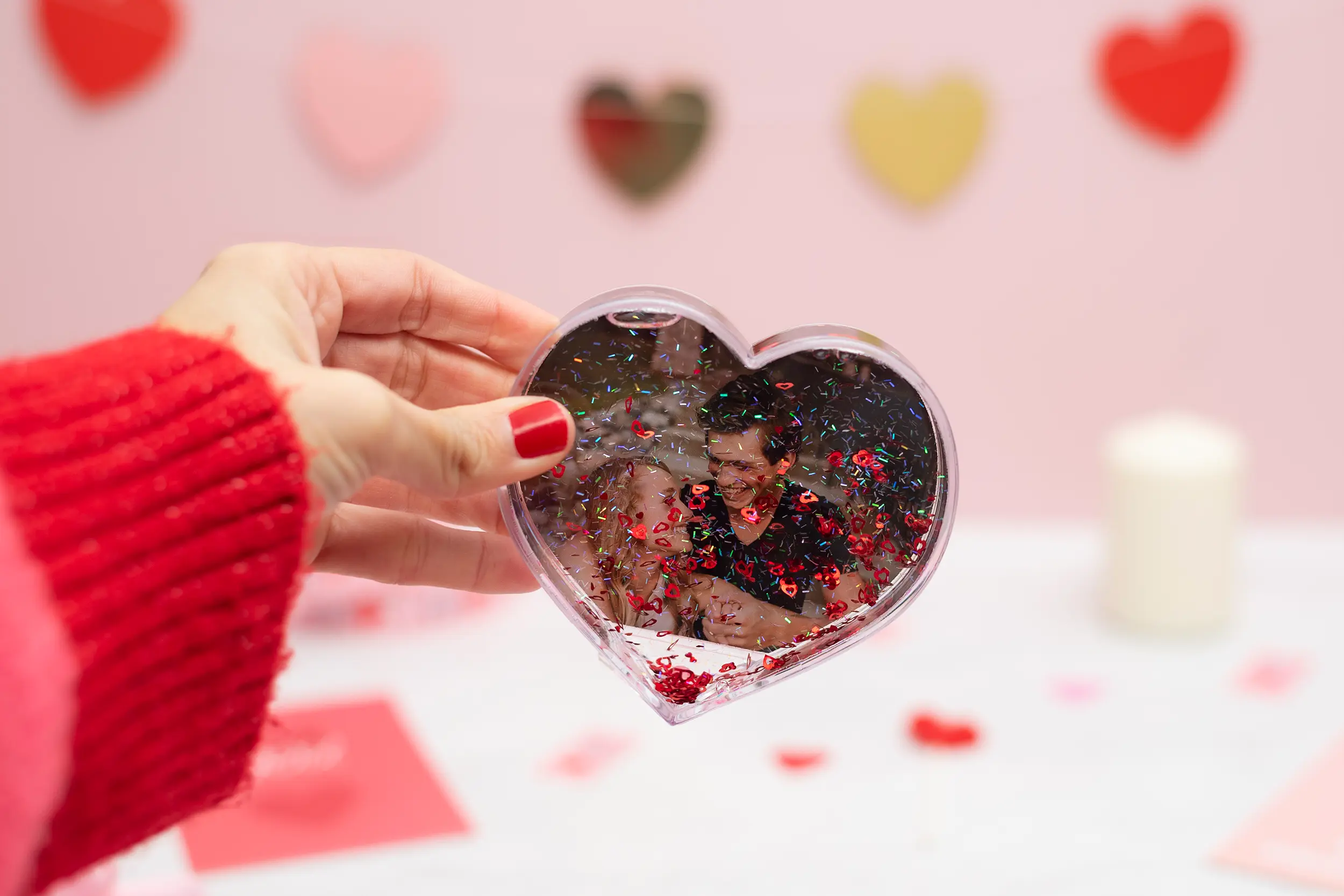 Tu fotografía más sentimental en una bola de nieve con forma de corazón. Además en su interior flotan pequeños corazones rojos. Un regalo super romántico para una ocasión especial.