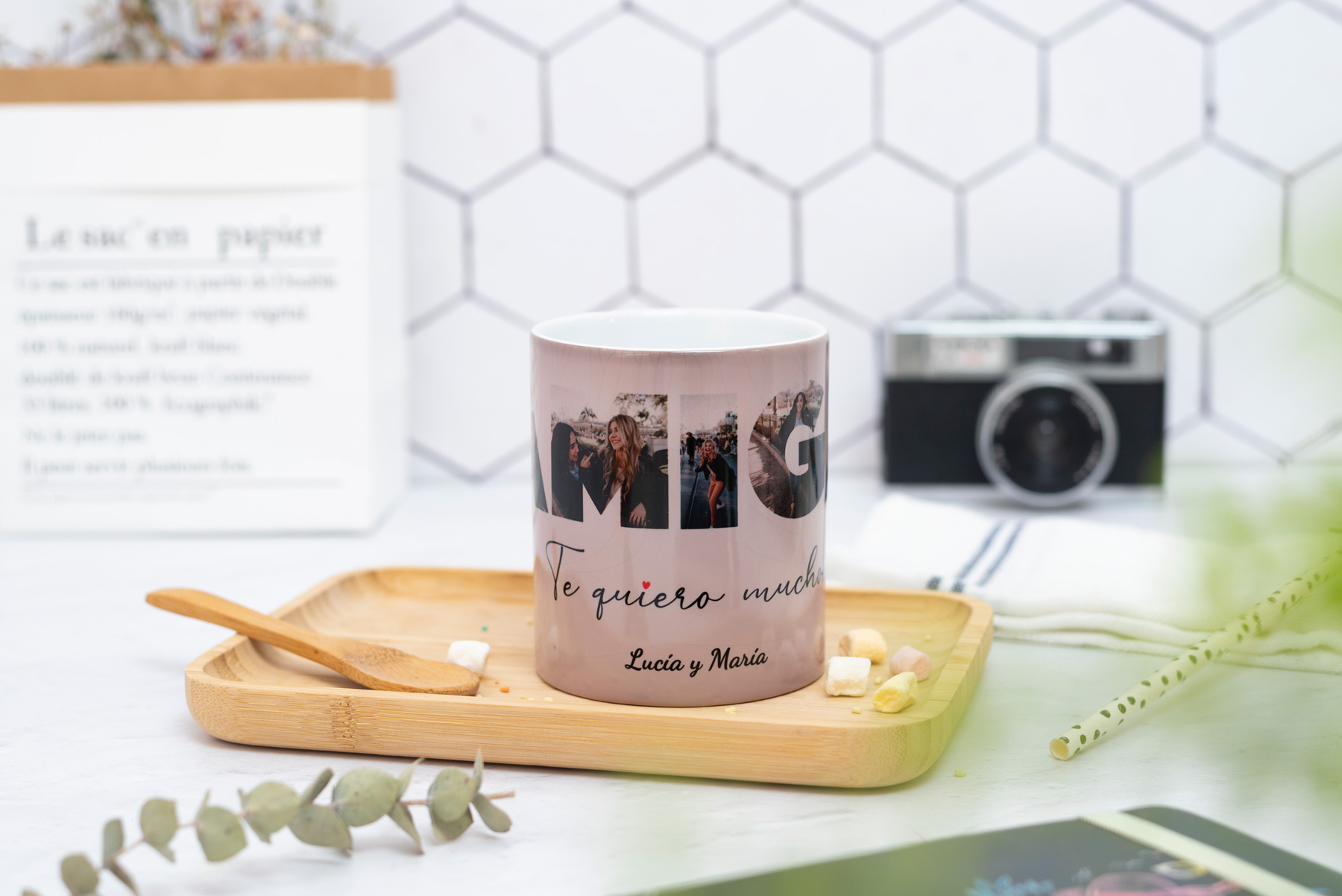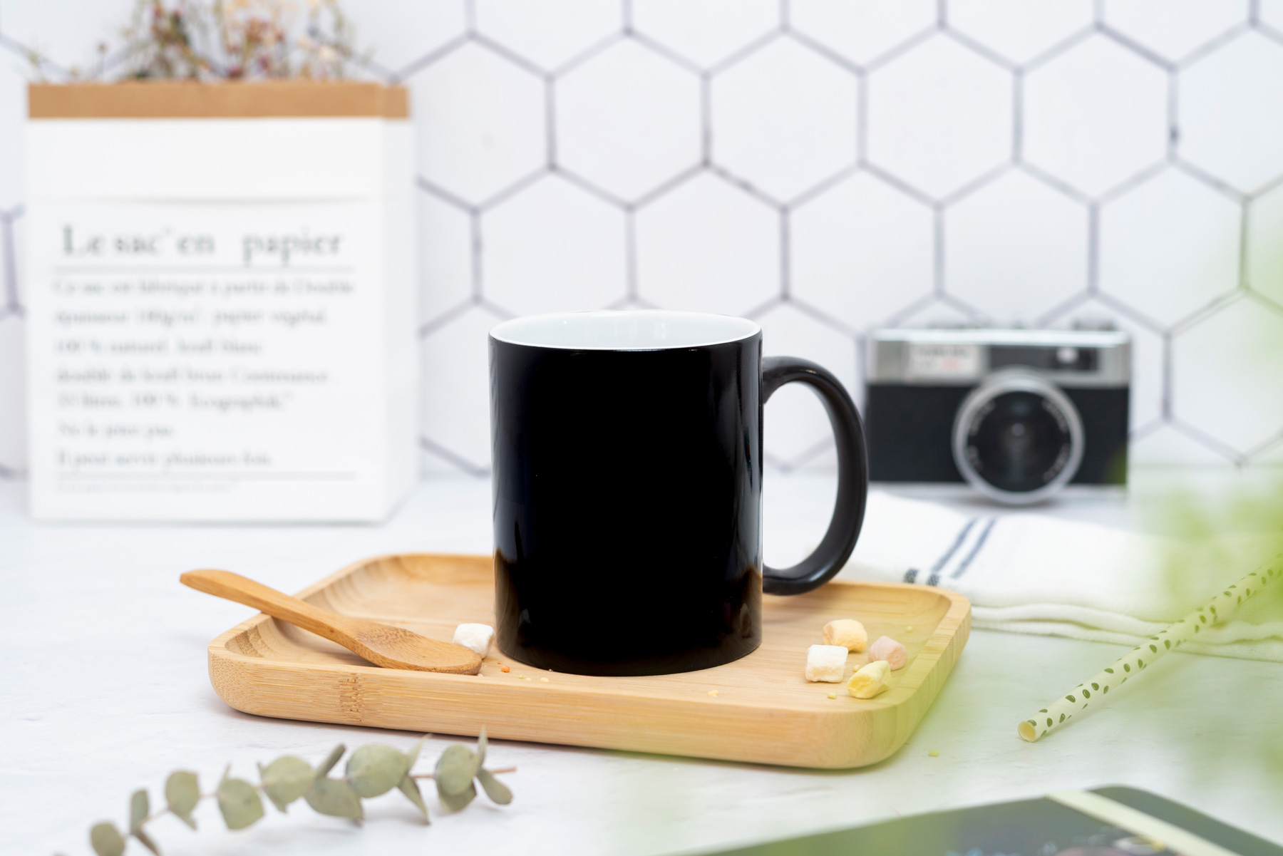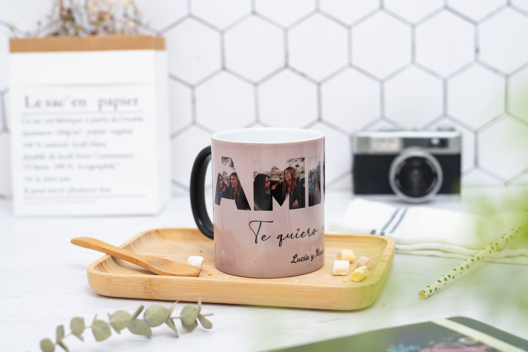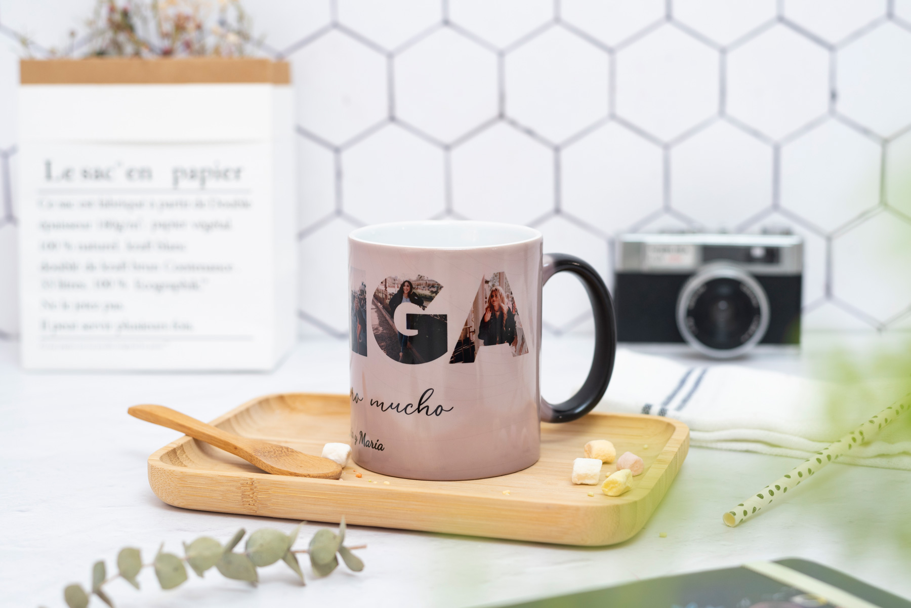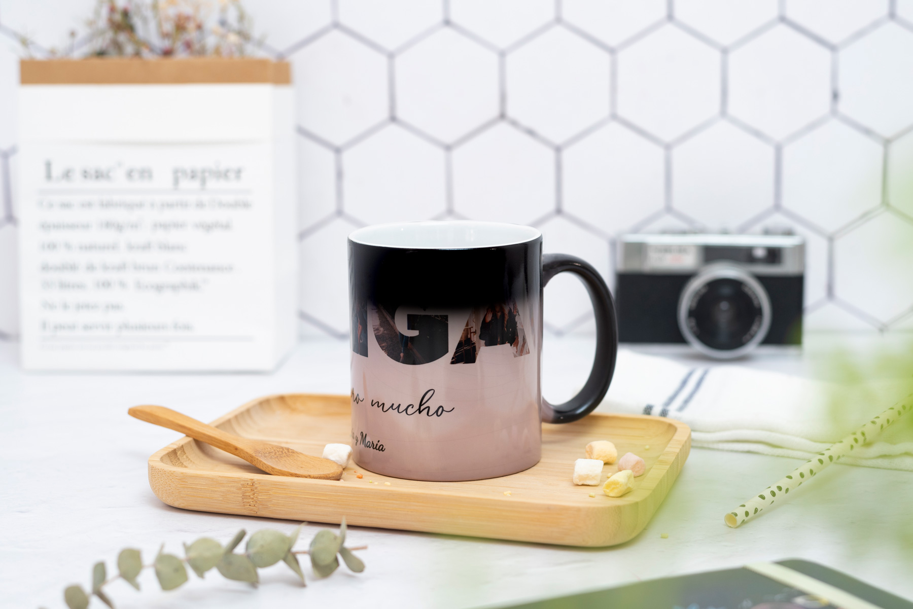 Taza en color negro que al verter un líquido caliente en el interior… ¡Sorpresa! el color negro desaparece gradualmente y deja ver tu foto favorita.